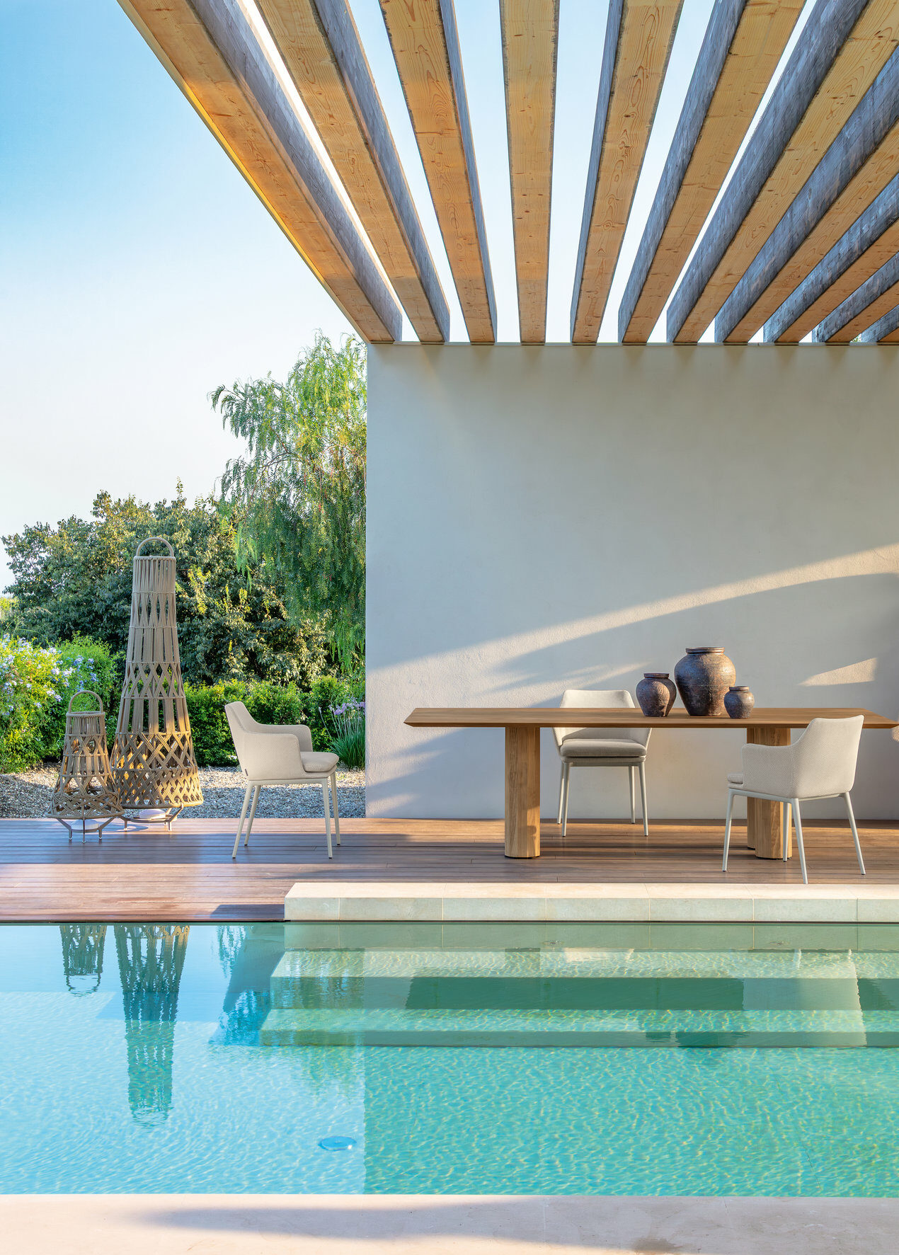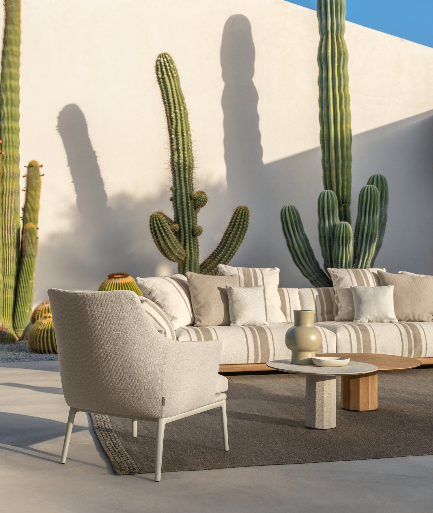 La collection Elton de Talenti, proposée par Eden Mobilier Alsace, allie design italien raffiné et modularité innovantepour l’extérieur. Ses canapés aux dossiers et accoudoirs inclinables, grâce à un mécanisme intégré, offrent un confort personnalisé et des formes élégamment courbées. Les tables basses en bois Accoya®, naturel ou palissandre, avec plateaux en verre émaillé, complètent cette collection, idéale pour composer des salons de jardin élégants et contemporains, parfaits pour terrasses, jardins ou espaces hôteliers.