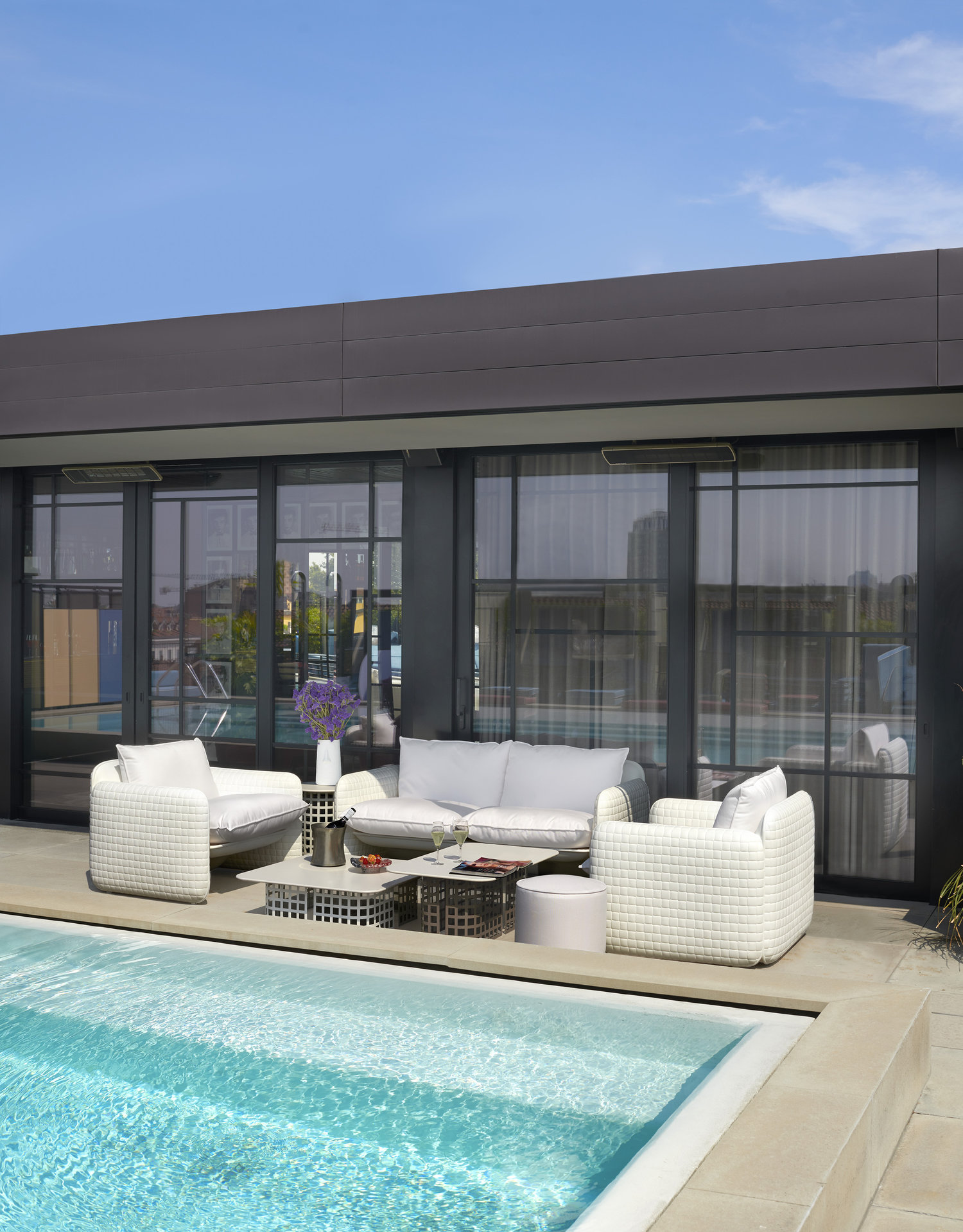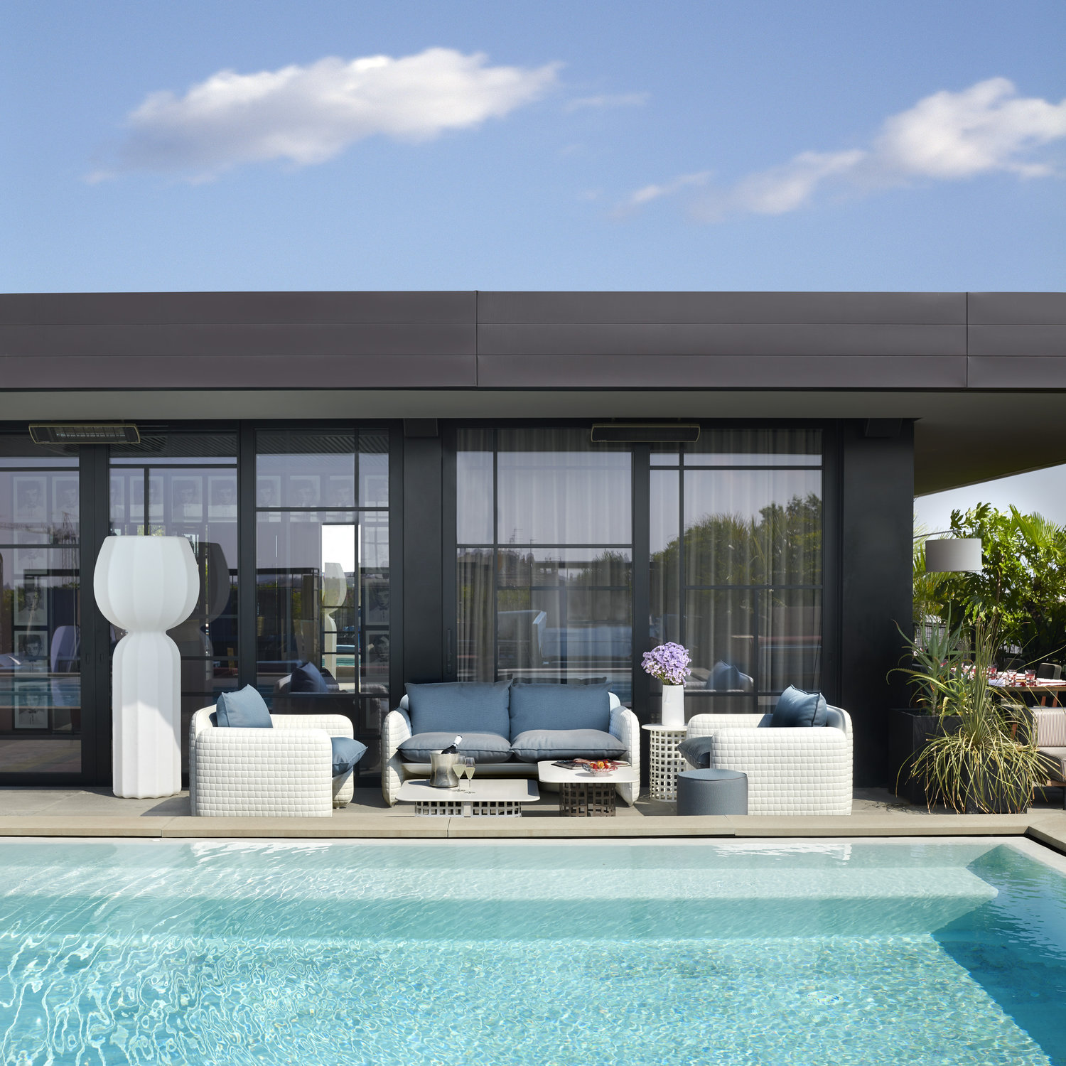 La collection Mara allie élégance contemporaine et confort raffiné. Chaque pièce, du fauteuil lounge au canapé deux places, se distingue par une structure en polyéthylène à la texture tressée rappelant le cuir artisanal, enrichie de coussins imperméables moelleux. Fabriquée en Italie, 100 % recyclable, elle s’adapte aussi bien aux intérieurs qu’aux espaces extérieurs.